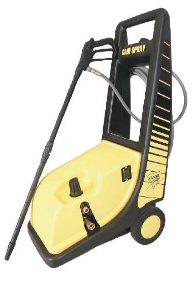the machine. The yellow hood hinges open for easy servicing of the pump.